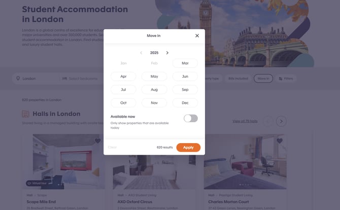Then select the move in filter on the search bar. Then select the month and year you want to move in and select apply.